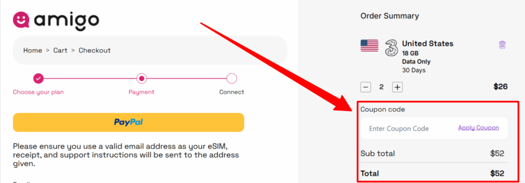 🛠️ How to Apply Amigo eSIM Coupon Code (Step-by-Step)
