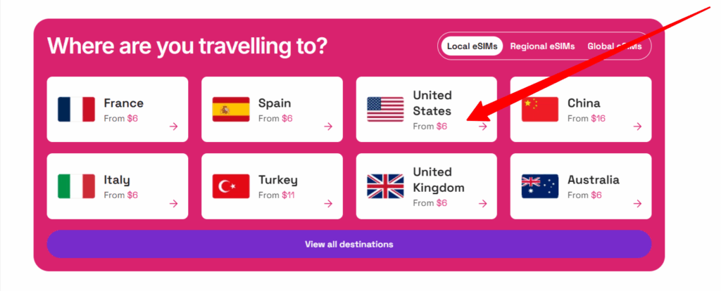 Step 2 – Choose your destination country (e.g., United States, Spain, France, Japan)