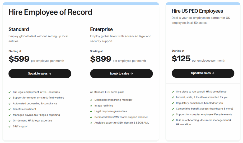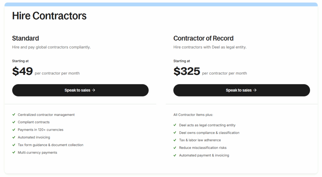 Deel provides modular pricing, meaning you only pay for what you use. Whether you are a small startup or a global enterprise, these plans are designed to handle compliance and payments in 150+ countries. 🌍